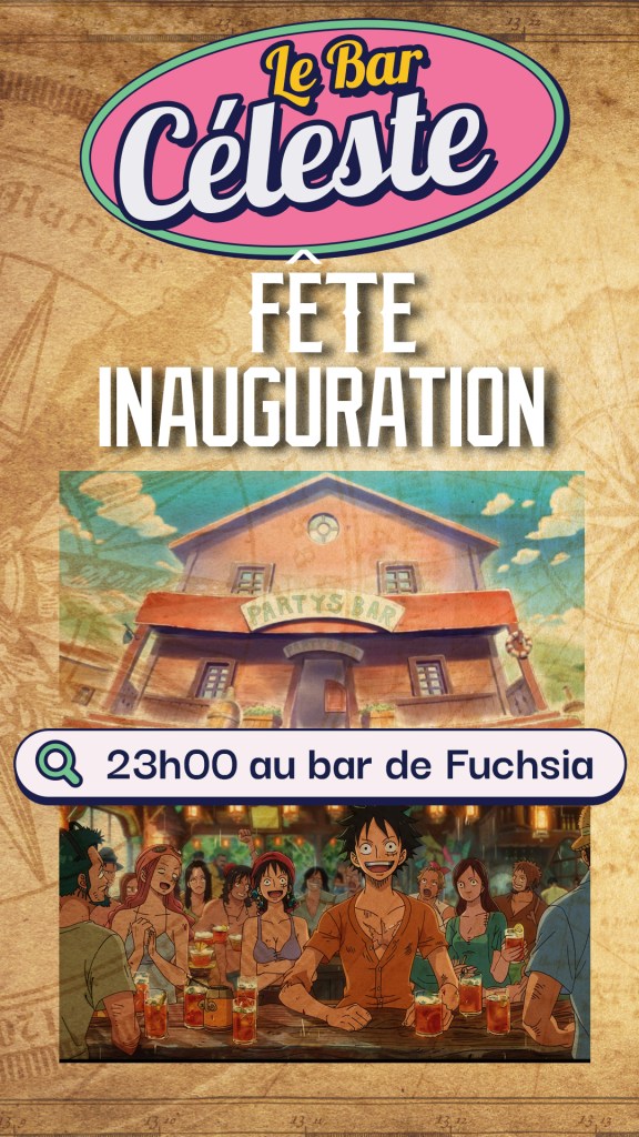 Nous avons organisé une fête d’inauguration pour le bar de Fushia. Il fallait bien que nous le fassions ! Le bar de LogueTown était déjà acté mais une fête là bas ne servirait pas à grand chose, alors nous avons voulu créer la meilleure occasion possible et organiser cette fête à fushia pour faire comprendre une bonne pour toute que le Bar est lui aussi un bar céleste géré par Ichini.