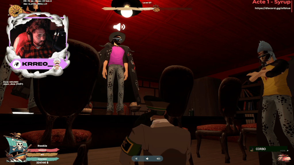 Après un briefing de Shinra Zarudo et de Riptine Van Hooks, nous nous sommes mis au travail. Le but était d’attirer Van Dutch au bar de Logue Town, un endroit très dangereux en raison de la proximité avec la Marine. Corbo était en charge de l’amener au bar sous prétexte d’une surprise de ses vieux amis, ce qu’il accepta.